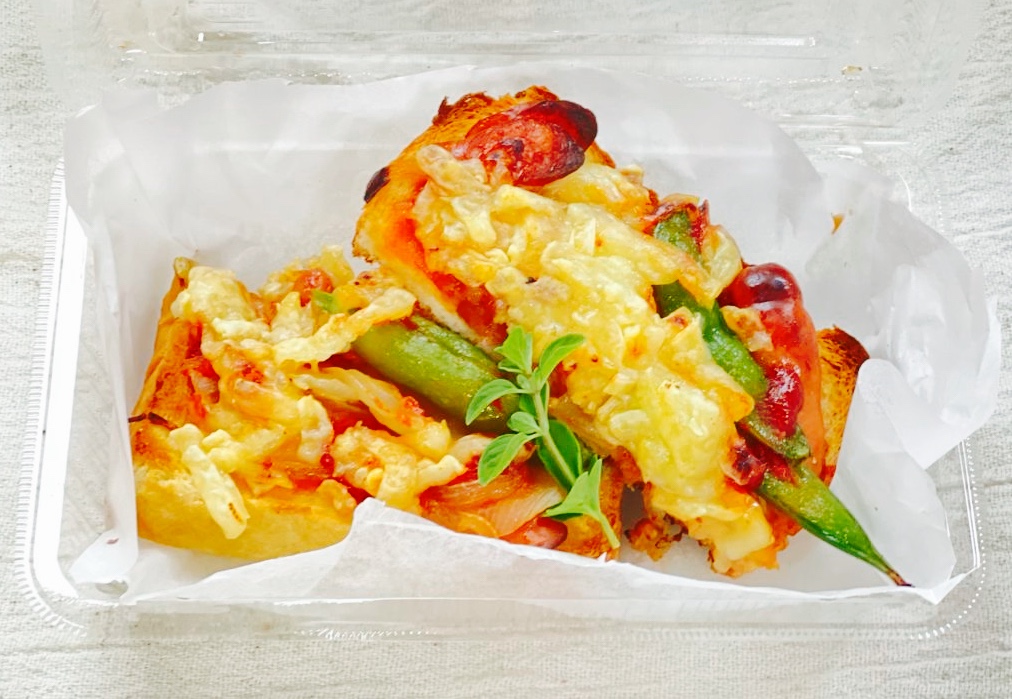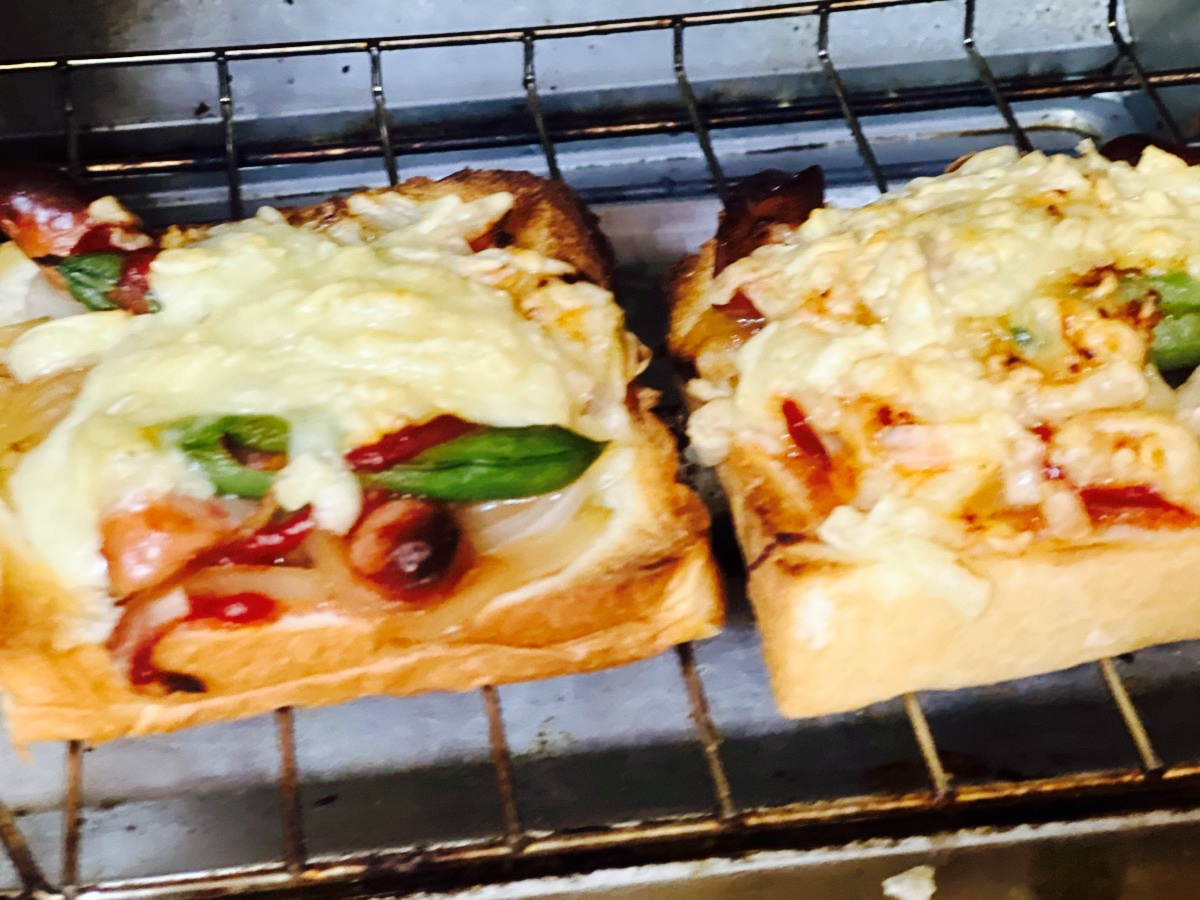 パンの上に具をのっけてトマトケチャップで味をつけたらとろけるチーズをパラリ。